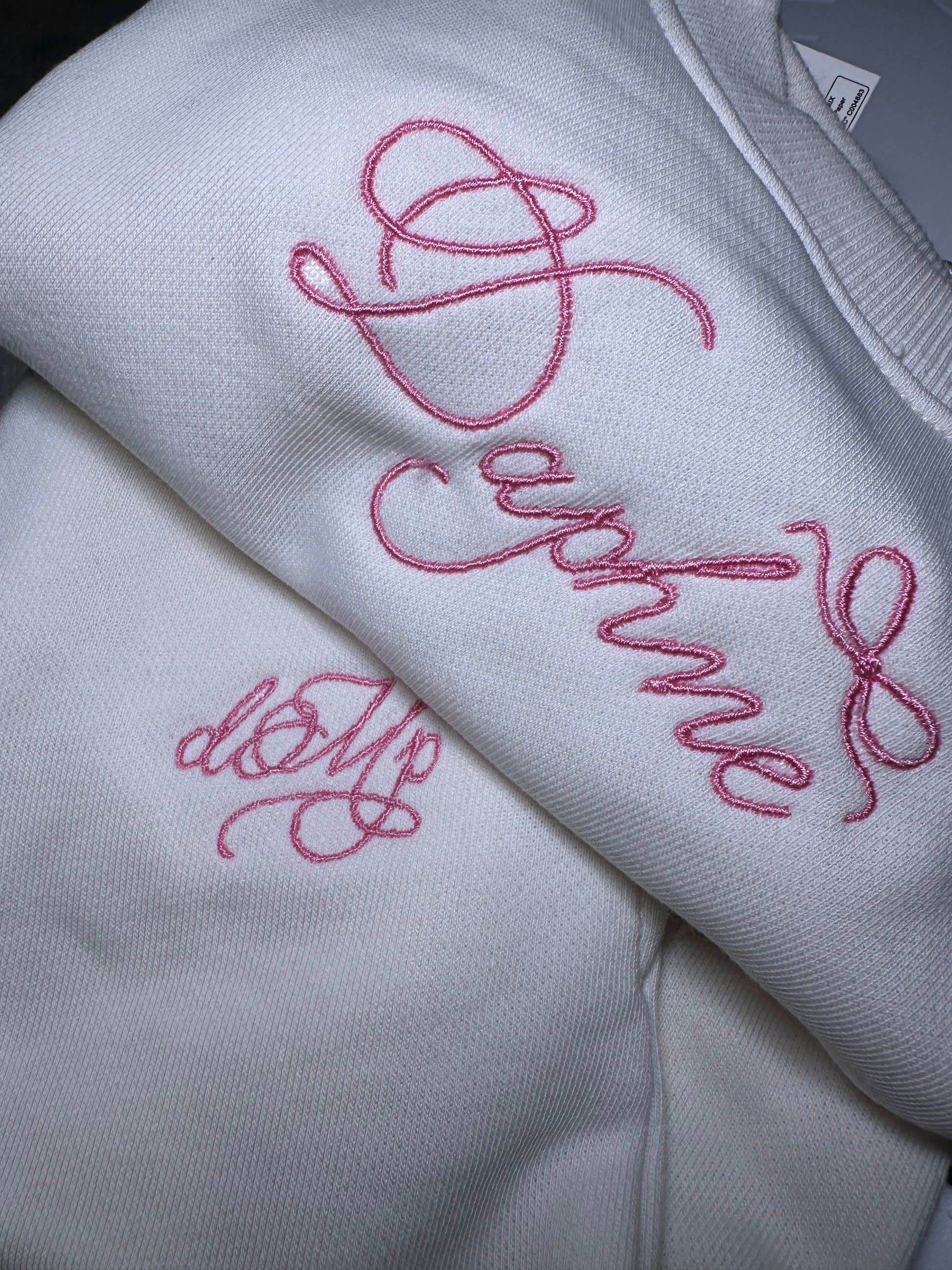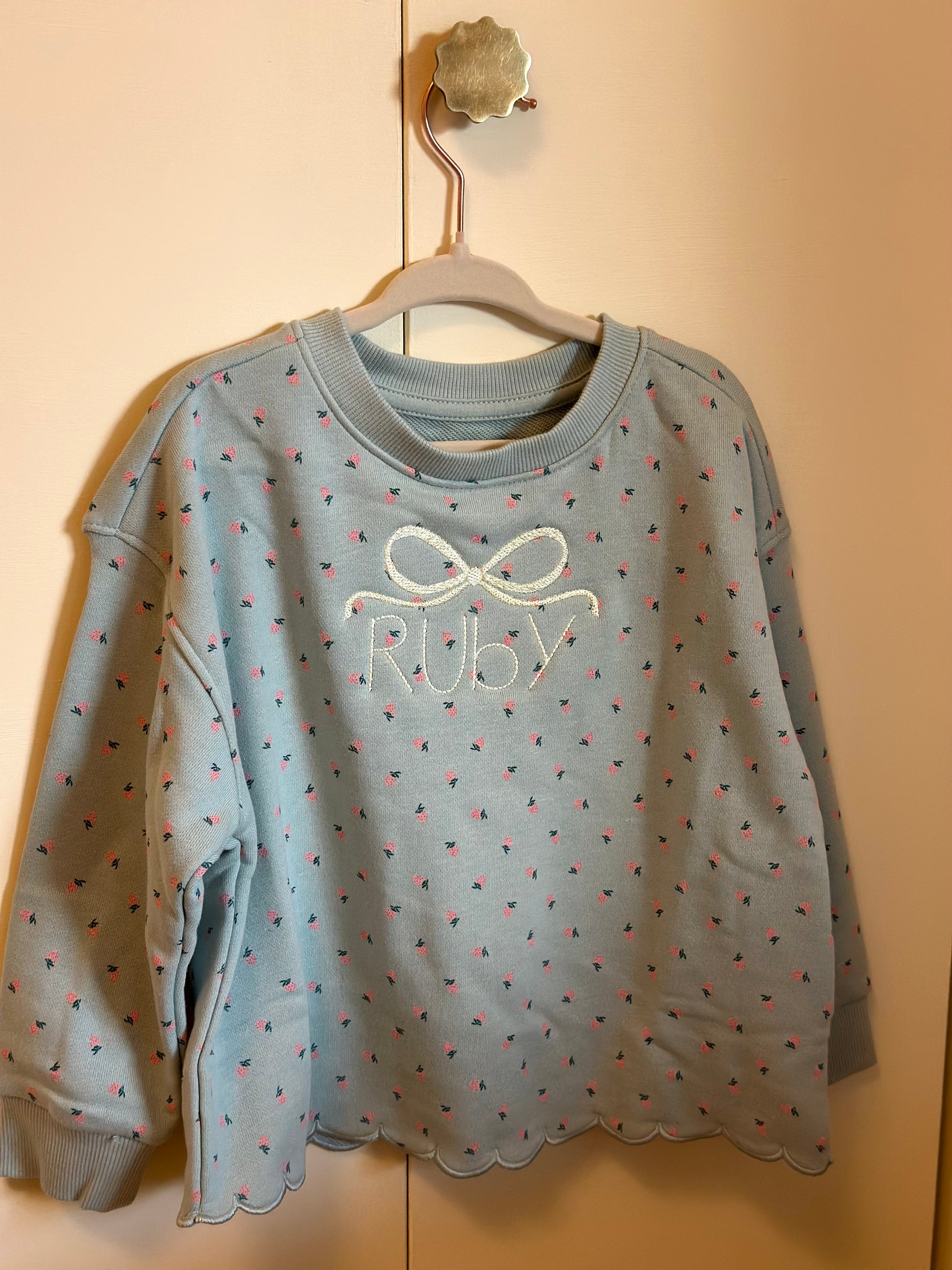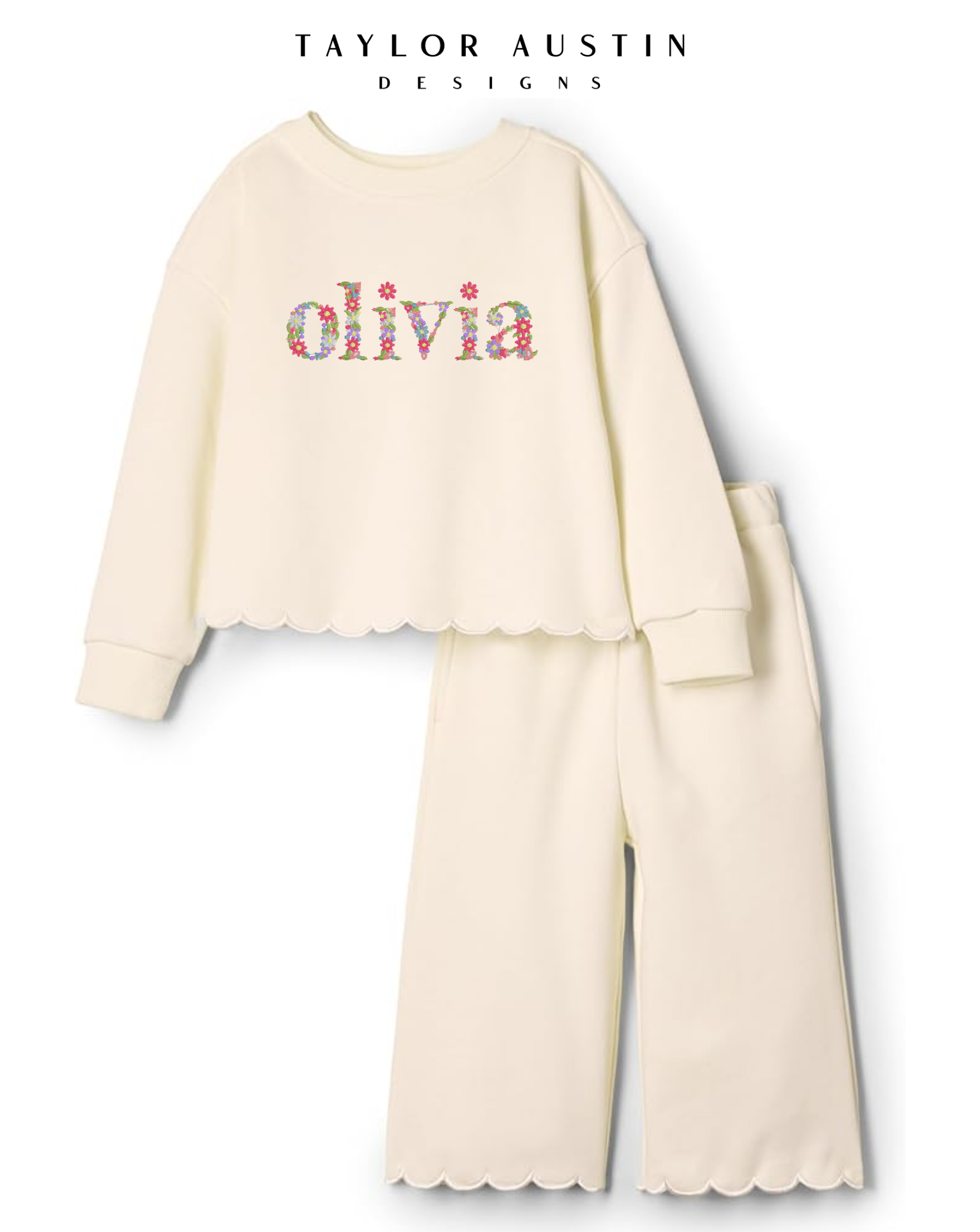 DETAILS: Embroidered scalloped edge, ribbed neckline and cuffs and easy pull-on waist with pockets